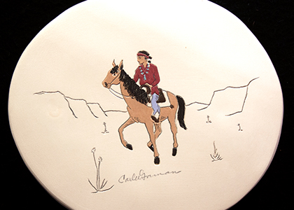 Carl Nelson Gorman, Kin-ya-onny-beyeh (Navajo) Born on the Navajo Reservation, Carl Nelson Gorman (1907-1998) was a member of the Khinyá’ áni clan (the Towering House People). Gorman began his career with his service in the U.S. Marines during WWII as a member of the elite group of Navajo Code Talkers who translated military intelligence into Navajo codes that were never broken. After the war, Gorman studied art at the Otis Art Institute in Los Angeles. To add to a long list of accomplishments, C.N. Gorman directed the Navajo Arts and Crafts Guild and was involved in and led a Navajo history project which conducted oral interviews with Navajo elders. After his time at Otis Art Institute, he became a technical illustrator for Douglass Aircraft, established his own silk-screen company and became an instructor in Native American Art at the University of California, Davis. Gorman’s work is displayed in national and international galleries and is known as an innovator in a variety of styles and media.